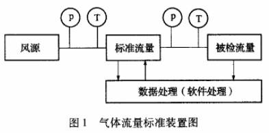 從風(fēng)源排出的具有--定流量的空氣經(jīng)標(biāo)準(zhǔn)表和被檢流量計(jì)時,在標(biāo)準(zhǔn)表中即產(chǎn)生一定頻率的電脈沖信號,經(jīng)與之配合的二次顯示儀表輸人電路放大整形后,送人系數(shù)單元,把脈沖單位轉(zhuǎn)換為流量單位,再送入顯示單元進(jìn)行累計(jì)量的數(shù)字顯示,然后通過介質(zhì)換算系數(shù)及溫度、壓力等全面修正得出流經(jīng)標(biāo)準(zhǔn)表的標(biāo)準(zhǔn)質(zhì)量流量,再通過與被檢表的指示質(zhì)量流量進(jìn)行比較,即可得出被檢表在該流量下的相對誤差。