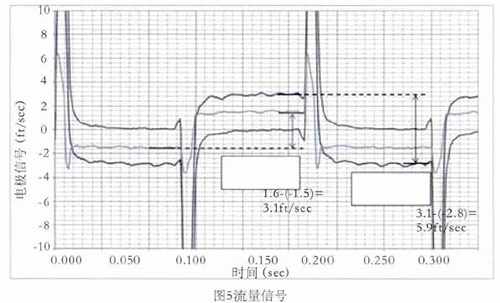 舉例,如圖5所示,線圈采用5Hz驅(qū)動(dòng)時(shí)的0feet/s,3.1feet/s,5.9feet/s流速下的電極信號(hào),利用上述方法對(duì)信號(hào)進(jìn)行處理并計(jì)算流速。取每半波*后的20%納入流速計(jì)算,正半波與負(fù)半波相減即是流速。如3.1feet/s–(-2.8feet/s)=5.9feet/s,雖然有+0.15 feet/s的直流偏置,但也不影響流速的計(jì)算。因線圈是5Hz驅(qū)動(dòng),半波的20%是20ms,正好是1個(gè)完整的工頻周期,這樣就不受工頻干擾的影響。正半波與負(fù)半波相減,這樣就避免了直流偏置和共模干擾的影響。再加上在數(shù)字濾波過程中使用限幅濾波和算數(shù)平均,保證了流量信號(hào)的有效提取。
