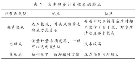 目前供熱行業(yè)內(nèi)使用的熱量計(jì)量?jī)x表按工作原理主要分為超聲波式、 電磁式、 差壓式, 其特點(diǎn)見表 1 。 熱量計(jì)量?jī)x表按結(jié)構(gòu)可分為一體式和分體式, 一體式熱量表將一支入口或出口溫度傳感器嵌入到流量傳感器管道中, 并配有專門的計(jì)算器進(jìn)行熱量計(jì)算; 分體式熱量表采用單獨(dú)的流量傳感器, 包括超聲波流量計(jì)、 電磁流量計(jì)、 差壓流量計(jì)、流量計(jì)等, 溫度測(cè)量采用單獨(dú)的鉑電阻溫度計(jì)或溫度變送器測(cè)量供回水管道溫度, 再配備熱量積算儀進(jìn)行溫度和流量信號(hào)采集得到熱量值。