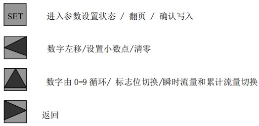 設(shè)置小數(shù)點:直接按 SET 鍵確認,進入默認流量參數(shù)設(shè)置菜單,顯示屏顯示 QP,按數(shù)字↑ 鍵設(shè)置標(biāo)志位。按數(shù)字← 鍵設(shè)置小數(shù)點,按→鍵可以返回菜單選擇項。