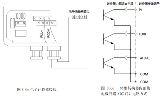 1.4.5 頻率(脈沖)、上下限報(bào)警、流向標(biāo)示等輸出均為集電極開路的電平輸出信號(hào)。
