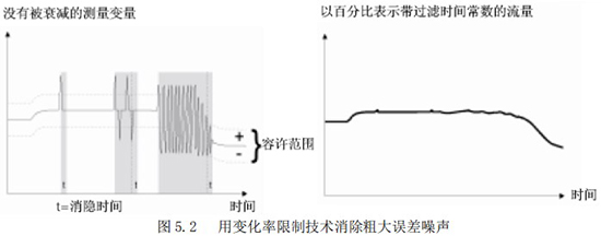 “變化率限制值”與“不敏感時(shí)間值”是用來消除某些增加阻尼不能除去的噪聲。它能夠從真實(shí)的流量信號中判別出階躍信號引起的噪聲和漿液尖狀噪聲。這種判別是以變化率的限制和持續(xù)時(shí)間為依據(jù)的。圖 5.2 所示為使用變化率限制技術(shù)去除粗大誤差的原理說明。該功能為在前面采樣中獲得的流量數(shù)據(jù)經(jīng)一階濾波后的,設(shè)定某一上限和下限(變化率)。如果當(dāng)前采樣的流量數(shù)據(jù)超過或低于這個(gè)極限值,而且在超過或低于這個(gè)極限值的變化時(shí)間之內(nèi),則認(rèn)為這種變化是由于噪聲所引起的,CPU 予以切除;而當(dāng)超過或低于這個(gè)極限值的變化在設(shè)置的不敏感時(shí)間以外,則認(rèn)為這種變化是由于真正的流量變化所引起,CPU 就認(rèn)可是測量流量的變化。
