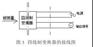 三線制變換器的接線圖如圖 2 所示,電流輸出系統(tǒng)除了兩根電流傳輸線以外,還有一根電源線向變壓器提供電源。三線制就是電源正端用一根線,信號(hào)輸出正端用一根線,電源負(fù)端和信號(hào)負(fù)端共用一根線。其供電大多為 DC 24V , 輸出信號(hào)有 DC4-20mA ,負(fù)載電阻為 250Ω 或者 DC0-10mA ,負(fù)載電阻為 0-1.5kΩ ;有的還有 mA 和 mV 信號(hào),但負(fù)載電阻或輸入電阻,因輸出電路形式不同而數(shù)值有所不同。