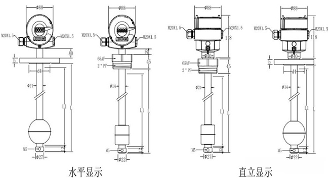 為更直觀地給用戶展現(xiàn)遠(yuǎn)傳浮球液位計的規(guī)格,請參考兩種遠(yuǎn)傳浮球液位計水平顯示以及直立顯示的不同規(guī)格尺寸,如下圖所示: