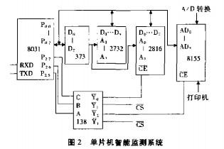 (3)單片機智能監(jiān)測系統(tǒng)該部分由8031單片機、地址鎖存器7415373、EPROM2732、E²PROM2816、并行接口8l55、地址譯碼器74LS138組成,如圖2所示: