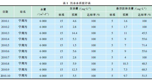 以一礦為例,2010年1~10月寧海污水站累計(jì)處理污水187萬m3,日均6200m3,1~10月份外輸污水含油累計(jì)達(dá)標(biāo)率100%,外輸懸浮物累計(jì)達(dá)標(biāo)率69.7%(見表1)。