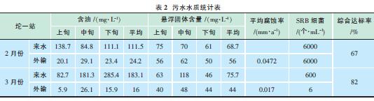 2011年2月坨一站來水含油平均183.1mg/L,外輸含油平均16mg/L,懸浮固體平均8.3mg/L,平均腐蝕率0.017mm/a,SRB 細(xì)菌平均6個(gè)/mL。只有懸浮固體含量超標(biāo)。