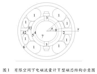 T型磁芯是為較小的空間下實現(xiàn)盡可能大的勵磁線圈而提出的,如圖1所示為較小空間結構下,設計有T型磁芯的井水流量計傳感器截面圖。在圖中1表示線圈位置;2表示磁芯位置;3表示電極及其固定器件位置;4表示襯里位置;5表示內(nèi)徑壁位置;6表示外徑壁;7表示測量管道(測量區(qū)域)。如圖1所示井水流量計勵磁結構磁芯造型近似為T型(因稱為T型磁芯),磁芯在靠近井水流量計內(nèi)管道時為T型磁芯的較長端。如圖中所示,T型磁芯較長端與x軸夾角為a,T型磁芯較短端與x軸夾角為b,T型磁芯較長端寬度為k1,T型磁芯較短端寬度為k2。