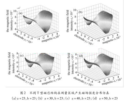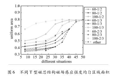 仿真實驗證明在有限的空間下,修改T磁芯的不同參數(shù),可以增加流量計測量區(qū)域內(nèi)部的磁場分布情況,也可以適當?shù)恼{(diào)整流量計測量區(qū)域中的磁場強度與均勻度,根據(jù)生產(chǎn)測井中的實際工況,改變井水流量計的T磁芯參數(shù)獲得設計參數(shù)。