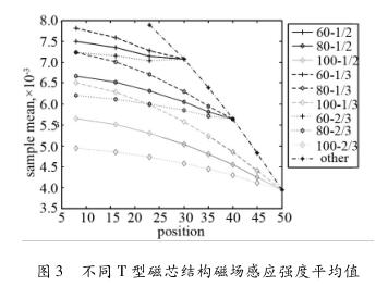 如圖3所示為不同T型磁芯結構下測量區(qū)域產(chǎn)生磁場感應強度平均值,圖中橫坐標為T型磁芯b的角度,縱坐標為測量區(qū)域的平均磁場強度,圖標表示的是T型磁芯的不同a的角度以及磁芯長端寬度所占的比例。其中以“角度-比例”表示,例如30-1/2表示T型磁芯的較長端角度a為30°,k1/(k1+k2)為1/2時的測量區(qū)域中平均磁場強度測量結果。圖標Other為T型磁芯較長端的角度a與較短端的角度b相等(即為23,30,35,40,45,50)時的流量計測量區(qū)域中的平均磁場強度。從仿真結果可以看出:T型磁芯的較長端的角度a越小,流量計測量區(qū)域中平均磁場強度越大;在T型磁芯的較長端的角度a一定時,T型磁芯的較短端的角度b越小,流量計測量區(qū)域中平均磁場強度越大;在T型磁芯的較長端的角度a與較短端的角度b一定時,T型磁芯的k1/(k1 + k2)越小,在流量計測量區(qū)域中平均磁場強度越大。