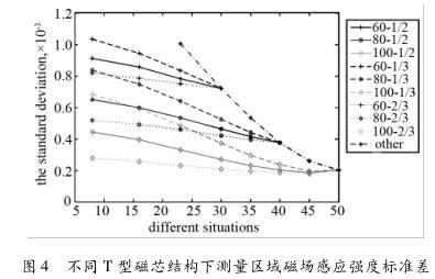 如圖4所示為不同T型磁芯結構下測量區(qū)域產(chǎn)生磁場感應強度標準差,圖中橫坐標為T型磁芯b的角度,縱坐標為測量區(qū)域磁場強度的標準差,圖標圖例與圖3中一致。從仿真結果可以看出:T型磁芯的較長端的角度a越小,流量計測量區(qū)域中磁場強度標準差越大;在T型磁芯的較長端的角度a一定時,T型磁芯的較短端的角度b越小,流量計測量區(qū)域中磁場強度標準差越大;在T型磁芯的較長端的角度a與較短端的角度b一定時,T型磁芯的k1/(k1 + k2)越小,在流量計測量區(qū)域中磁場強度標準差越大。