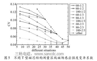 標準差代表磁場測量區(qū)域的磁場分布波動性較大,因而需引入變異系數(shù)對測量區(qū)域中的磁場分布情況進一步分析。如圖5所示為不同T型磁芯結構下測量區(qū)域磁場感應強度變異系數(shù),圖中橫坐標為T型磁芯b的角度,縱坐標為測量區(qū)域磁場強度分布的變異系數(shù),圖標圖例與圖3中一致。從仿真結果可以看出:T型磁芯的較長端的角度a越小,流量計測量區(qū)域中磁場強度變異系數(shù)越大;在T型磁芯的較長端的角度a一定時,T型磁芯的較短端的角度b越小,流量計測量區(qū)域中磁場強度變異系數(shù)越大;在T型磁芯的較長端的角度a與較短端的角度b一定時,T型磁芯的k1/(k1 + k2)越小,在流量計測量區(qū)域中磁場強度變異系數(shù)越大。異系數(shù)越大說明磁場分布越不均勻,波動性越大;異系數(shù)越小說明磁場分布趨向均勻。下面通過計算測量區(qū)域中的磁場均勻區(qū)域來對這一結果進一步的分析。