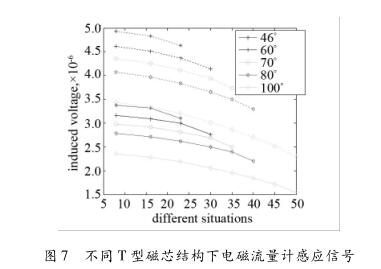 從仿真結果可以看出:T型磁芯的較長端的角度a越小,流量計電極兩端獲得的感應信號越大;在T型磁芯的較長端的角度a一定時,T型磁芯的較短端的角度b越小,流量計電極兩端獲得的感應信號越大。這主要是因為井水流量計勵磁線圈的增加,使得流量計測量區(qū)域的磁場強度增加,同樣分布的流速下使得流量計電極兩端的感應信號增加。