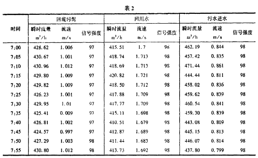 下面是隨機地從計算機中抽取的某一日的幾組數(shù)據(jù)(表2)。從表中可以看出采用超聲波流量計側(cè)量數(shù)據(jù)精確度較高,讀取數(shù)據(jù)方便,從信號強度上可以看出,在測量回流污泥時,信號強度較低,這是由于液體濁度較高,含有較大固體顆粒引起信號衰減造成的。