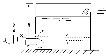 案例4 廣西某水廠在郊區(qū)山頭設(shè)置清水池,利用水池高度勢(shì)能發(fā)送成品水。運(yùn)行人員反映計(jì)量出水量的DN700mm酸堿污水流量計(jì)有時(shí)候流量顯示不穩(wěn)?;蝿?dòng)達(dá)百分之十幾到百分之二十,誤差也大,估計(jì)相差約20%。現(xiàn)場(chǎng)考查發(fā)現(xiàn)水池如圖7-9所示安裝流量傳感器,水位高度不足就會(huì)卷入氣泡,甚至流量傳感器測(cè)量管內(nèi)不能充滿。如水位降至A線時(shí),雖高出吸入口頂端,但高出不多,還會(huì)在C處產(chǎn)生旋渦,將水位表面空氣卷入形成氣泡,使顯示晃動(dòng);若水位降到B,測(cè)量管將不滿管。我們建議如圖虛線所示裝一彎頭,擴(kuò)大水池有效容量,減少吸入氣泡的機(jī)會(huì),彌補(bǔ)原設(shè)計(jì)的不足。這類實(shí)例是經(jīng)常遇到的。